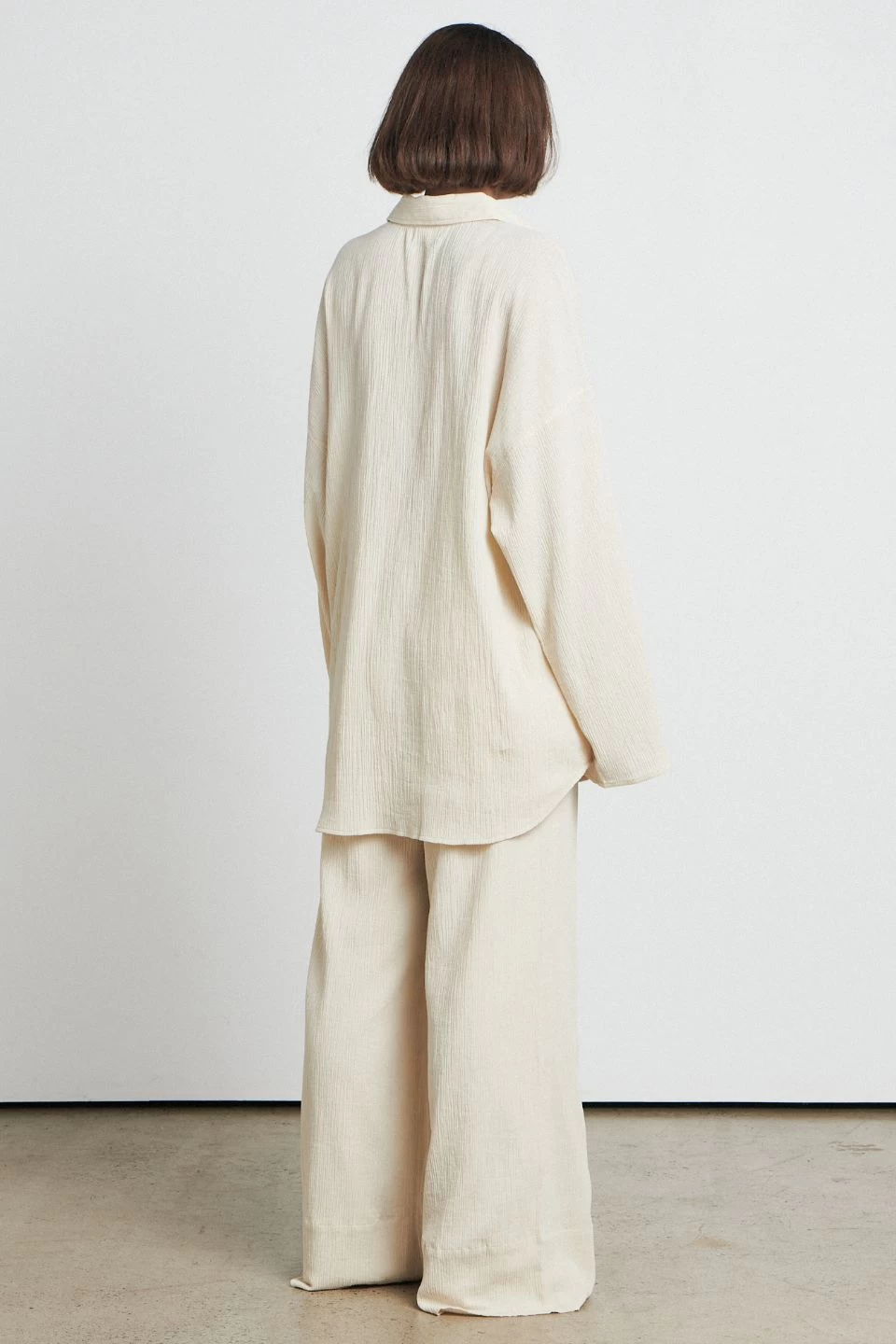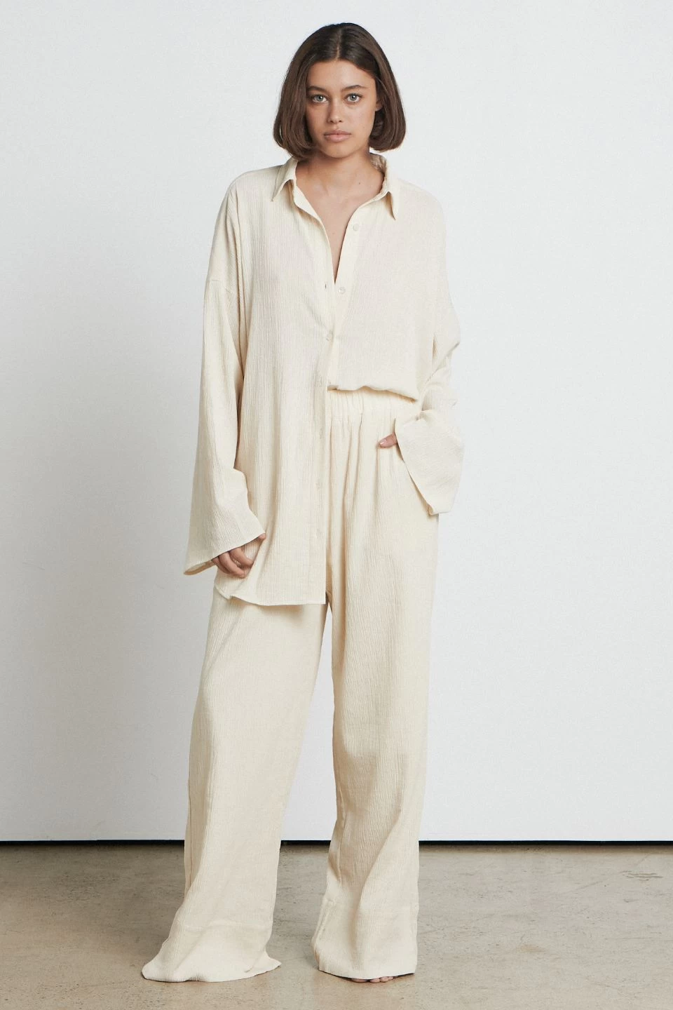 The perfect staple pant for your closet. The Crinkle Cream Pant from Bare is an essential for all your casual needs.