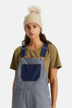 A 100% acrylic 1×1 heavyweight knit beanie with a debossed-leather Brixton label at cuff and faux-fur pom at top of hat.