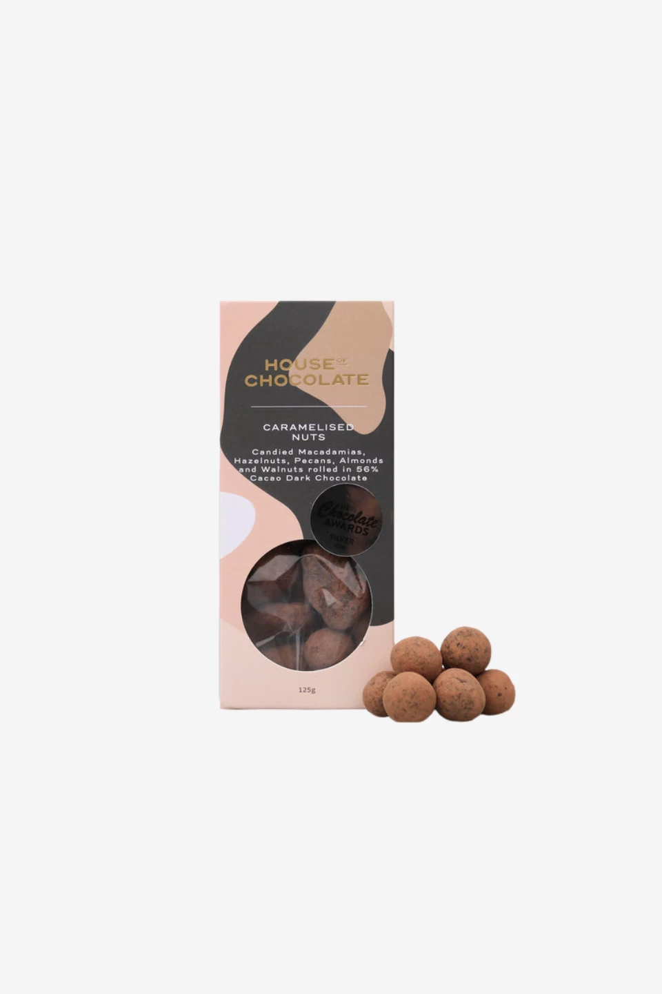 A medley of freshly caramelised macadamia, walnuts, hazelnuts, almonds & pecans coated in premium min. 55% Dark Chocolate and dusted in cacao powder.