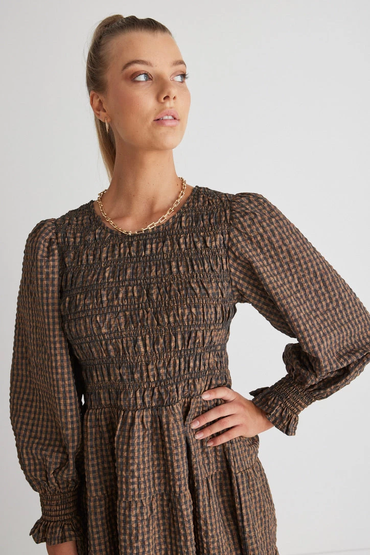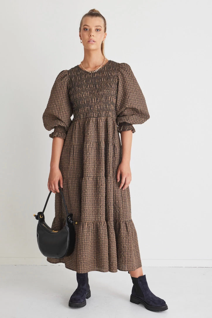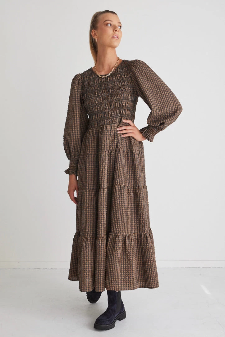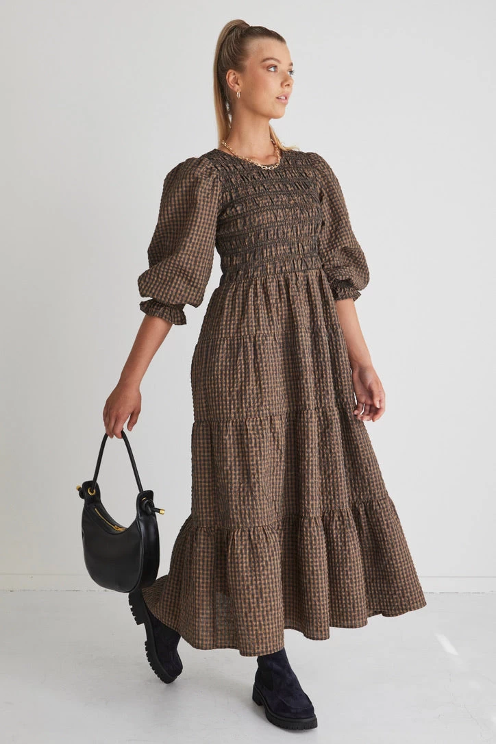 Piper Toffee Gingham Shirred Bodice Tiered Maxi Dress