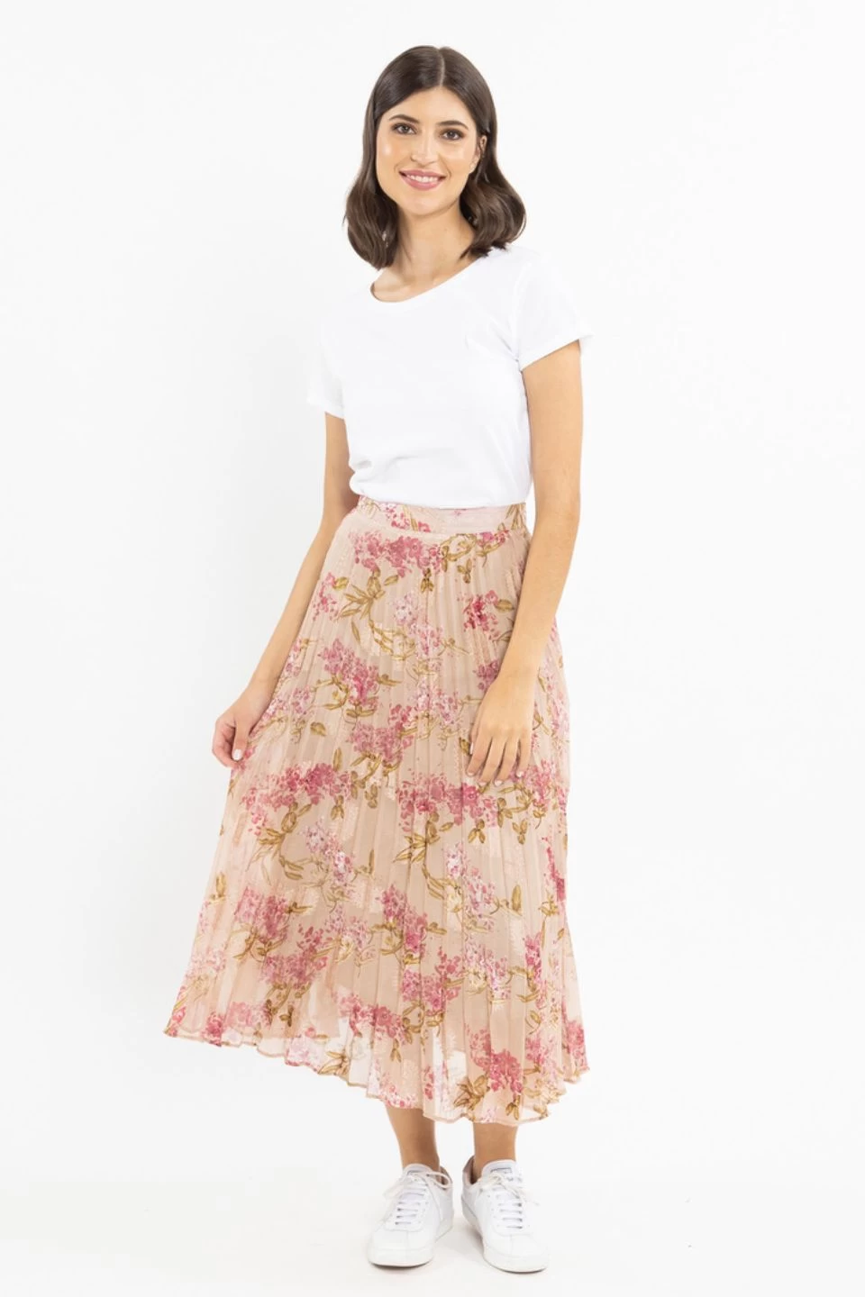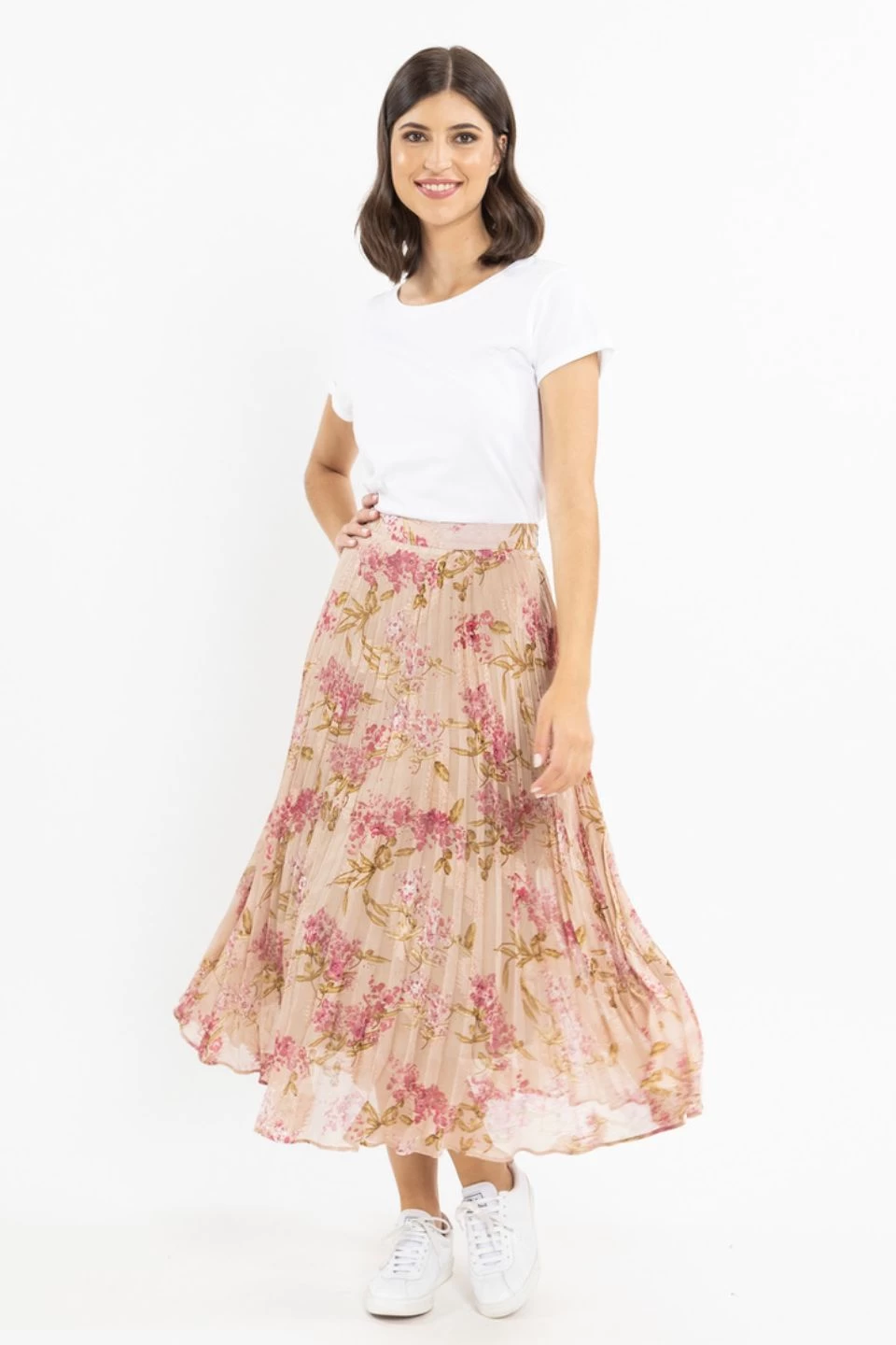 The perfect autumnal print skirt has landed. This pleasted midi skirt comes in a stunning blush floral, we love this skirt paired with a cosy knit and sneakers or boots and a blazer for a more elevated look.Â