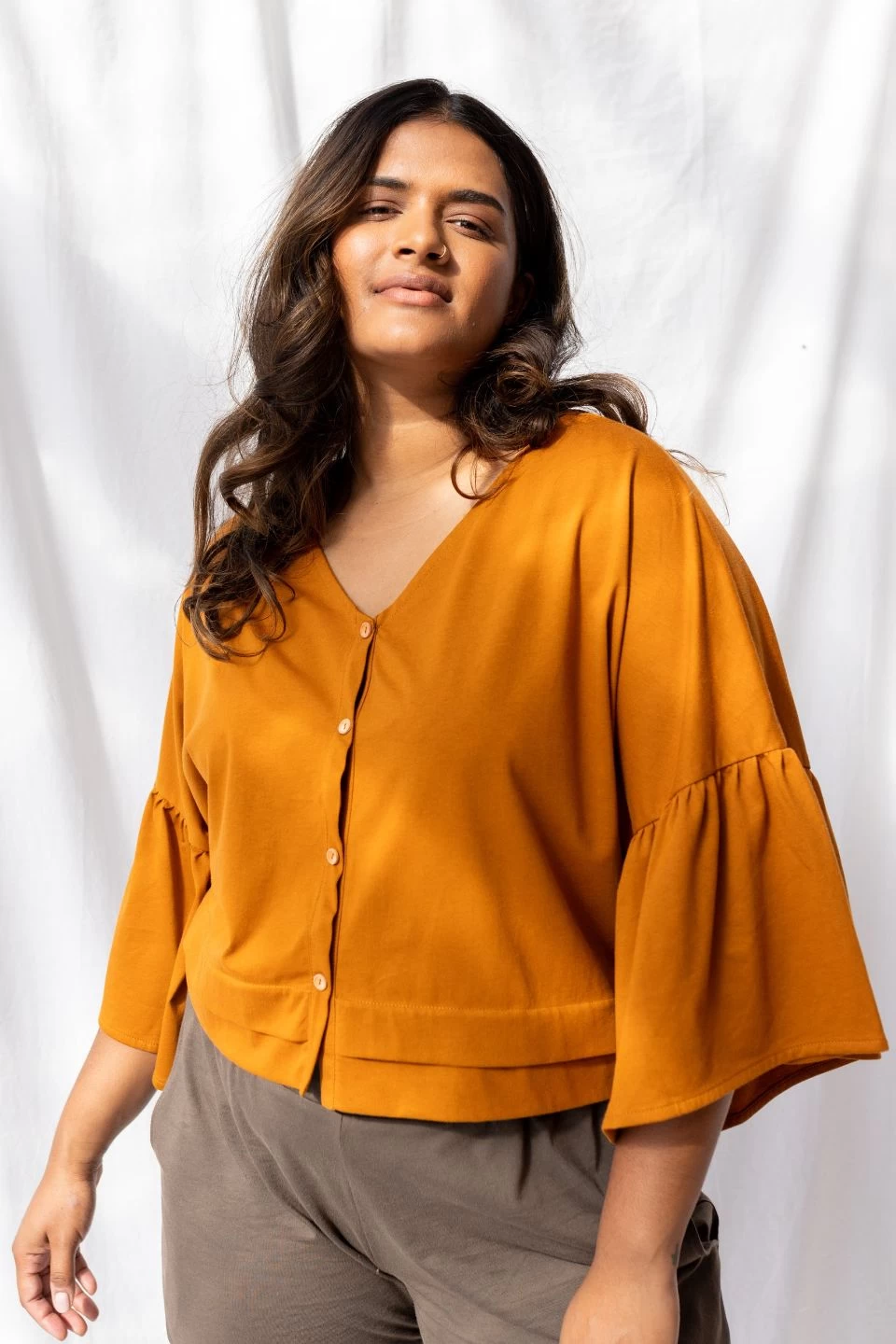 Featuring a reversible fit, statement gathered sleeves, a wide body, a double layer hemline, and a front placket with recycled cotton buttons.