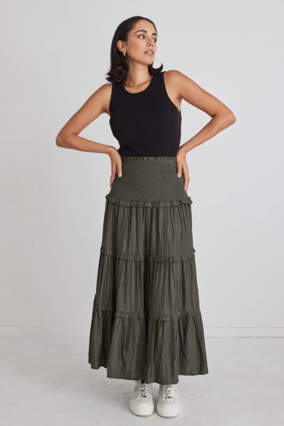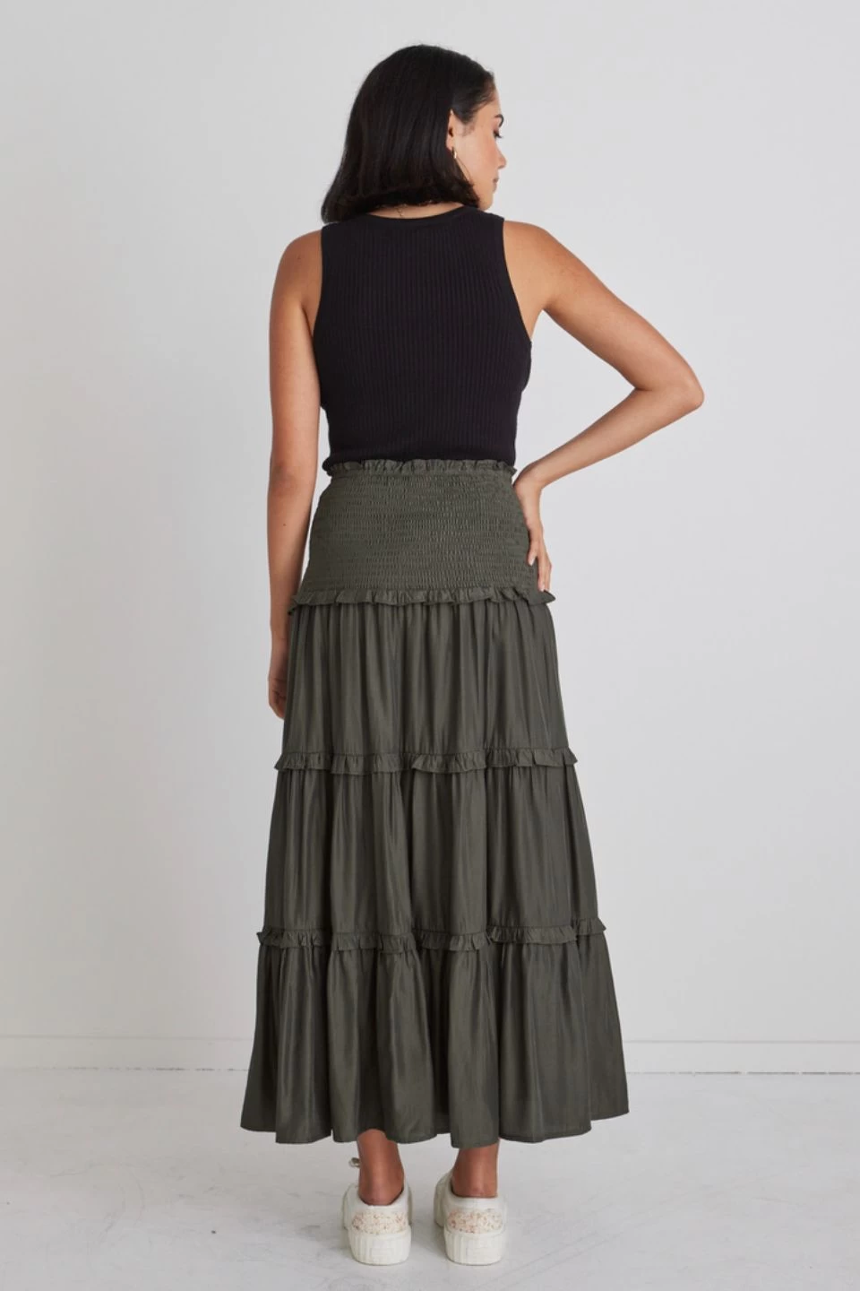 The Soaring High Dark Khaki Satin Ruffle Midi Skirt is the midi skirt you need! Wear day to day with a plain white tee and sneakers or dress it up with a floaty blouse and some boots.